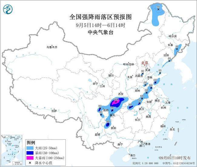r预计,9月5日14时至6日14时,内蒙古东北部、黑龙江西北部、吉林东部、辽宁东南部、山东南部、安徽北部、河南中南部、陕西南部、湖北中西部、四川东部、重庆西部、贵州西部等地部分地区有大到暴雨,其中,陕西南部、四川盆地东北部等地部分地区有大暴雨(100~180毫米)。上述部分地区伴有短时强降水(最大小时降雨量20~50毫米,局地可超过80毫米),局地有雷暴大风等强对流天气。